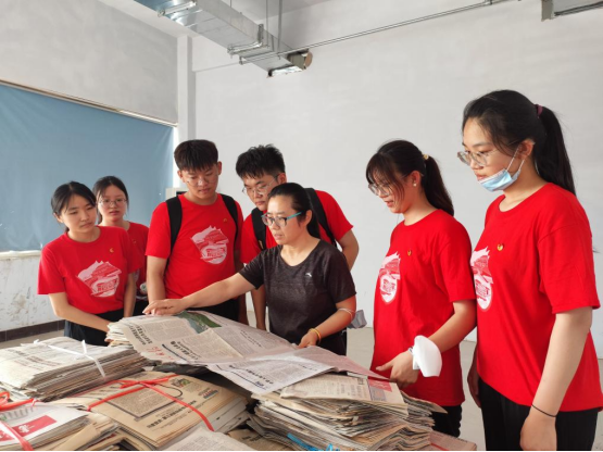 由于管理方法不当,储存环境简陋,该馆部分报纸呈现出“脏”“乱”“旧”的特征:储存环境地面积尘、时间排列顺序错乱、报纸纸张整体泛黄。同时,当天正午最高气温达到了38℃,天气较为炎热。实践队队员克服种种不利条件,在该馆工作人员指导下,依据报纸种类及发刊时间,系统性整合出近二十类报纸的2021年度合订本。