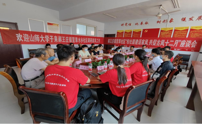参观结束后,一行人步入会议室,县联副主席张琳、办公室主任董冠华、团县委青少作活动中心主任赵洪亮等领导同志,以及郝王庄镇家风宣传员展开交流。会议伊始,吴报华介绍郝王庄销家风建设基地的基本情况,十位家风宣传员叙述了各自的家风故事;随后,工作人员向实践队队员发放家风文创产品。队员们紧紧围绕“如何将古风特色与家风传统相合”的主题提出了自己的见解。针对家风文化的宣讲问题,陈嘉露同学建议:“宣讲时要关注让观众的反应和状态,贴近观众认知,努力调动气氛。”