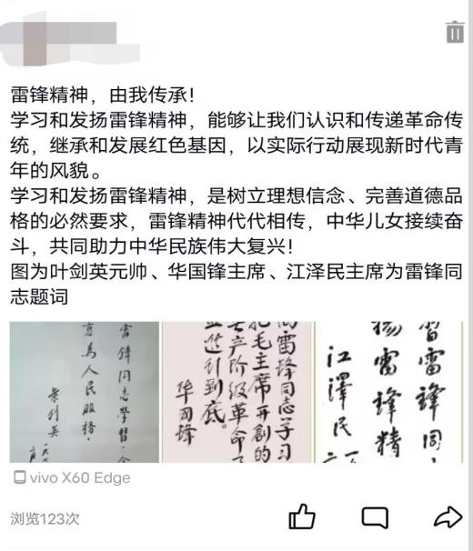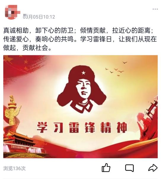 本次活动通过在QQ空间发布带有“雷锋精神,由我传承”标签并配上有关雷锋日的文案,以一种新颖的传播方式,扩大受众群体,发动身边的学生了解雷锋精神,学习雷锋精神,以此进一步加深同学们对雷锋精神的理解和学习。
